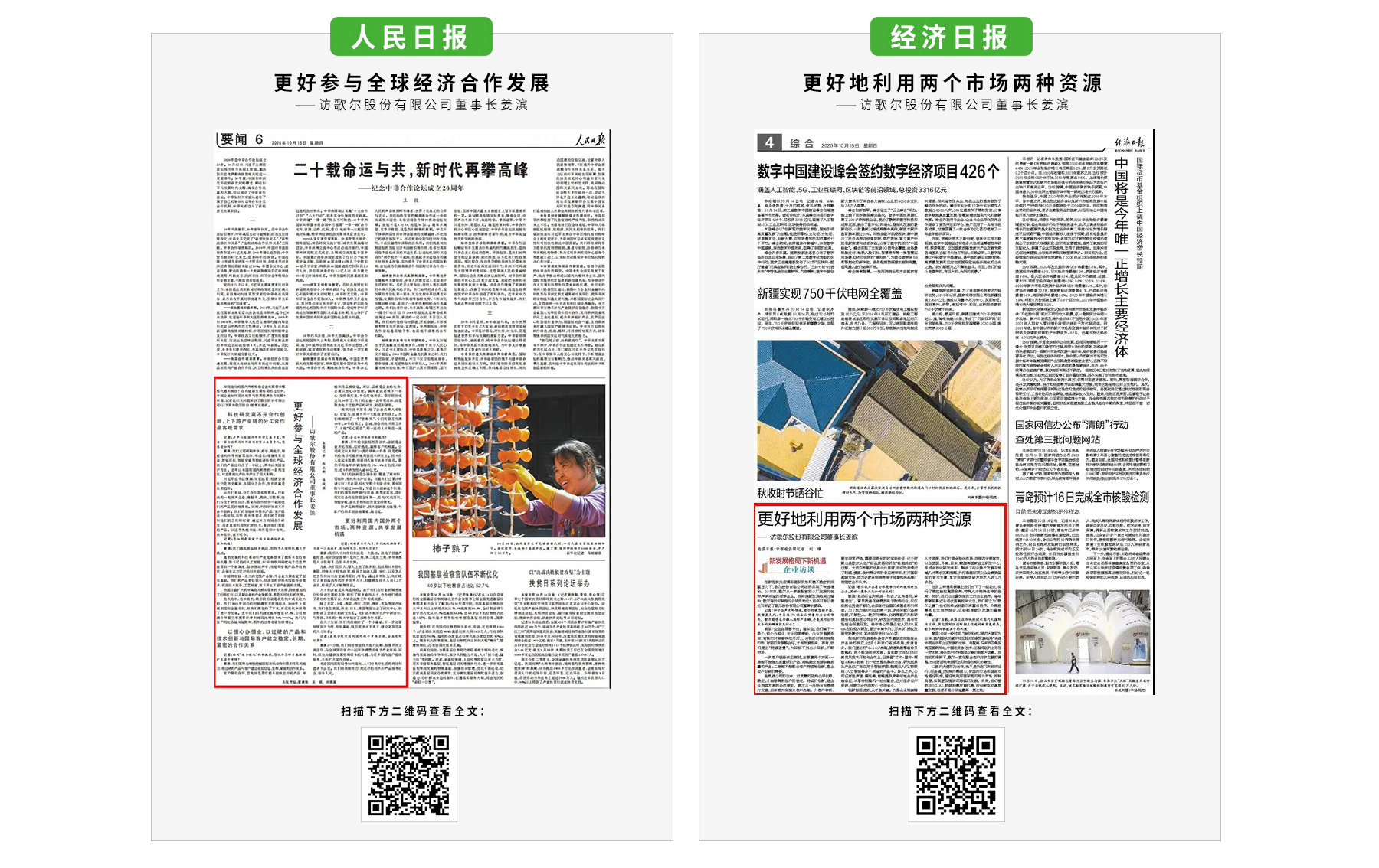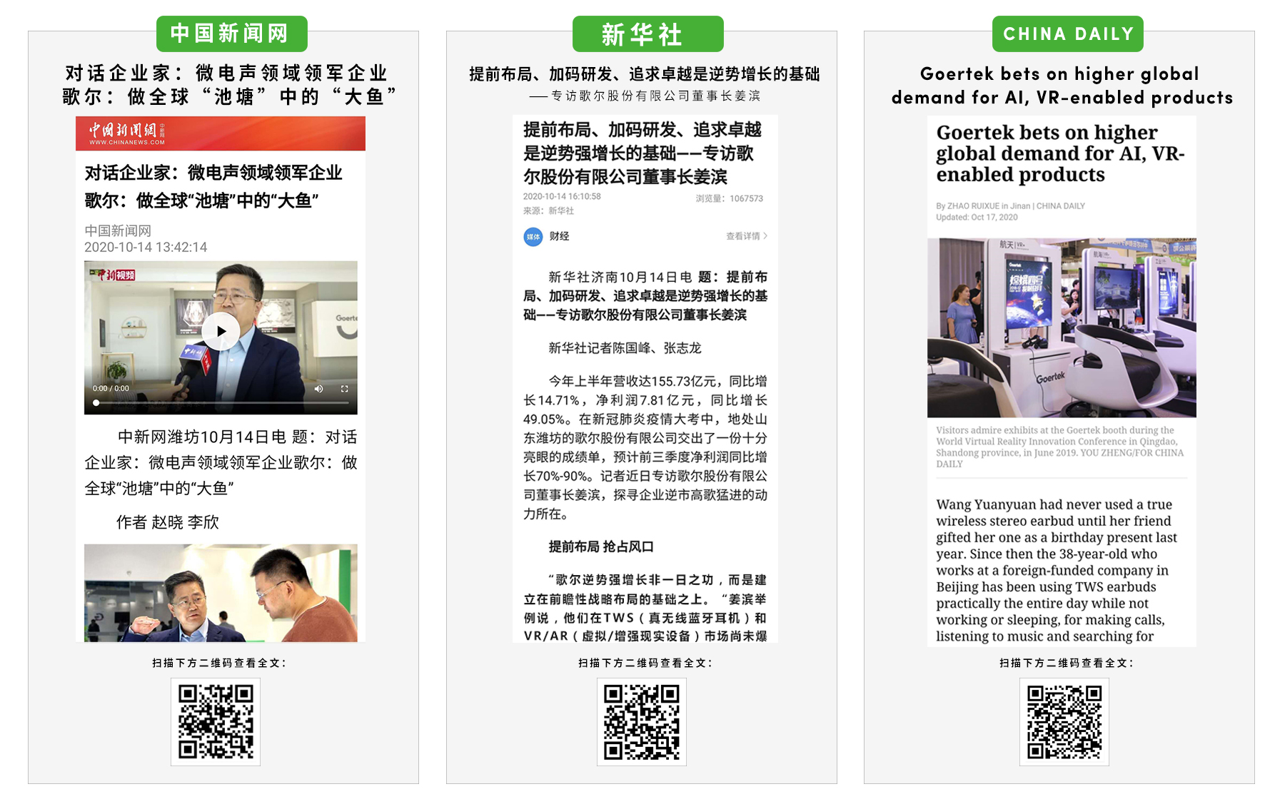 近日,CCTV、人民日报、新华社、经济日报、中国日报、中国新闻网等多家中央媒体关注歌尔的成长,相继在重点版面报道歌尔。10月19日晚,央视《新闻联播》节目播放了对歌尔股份董事长姜滨的专访,并为歌尔创新研发和全球布局点赞。